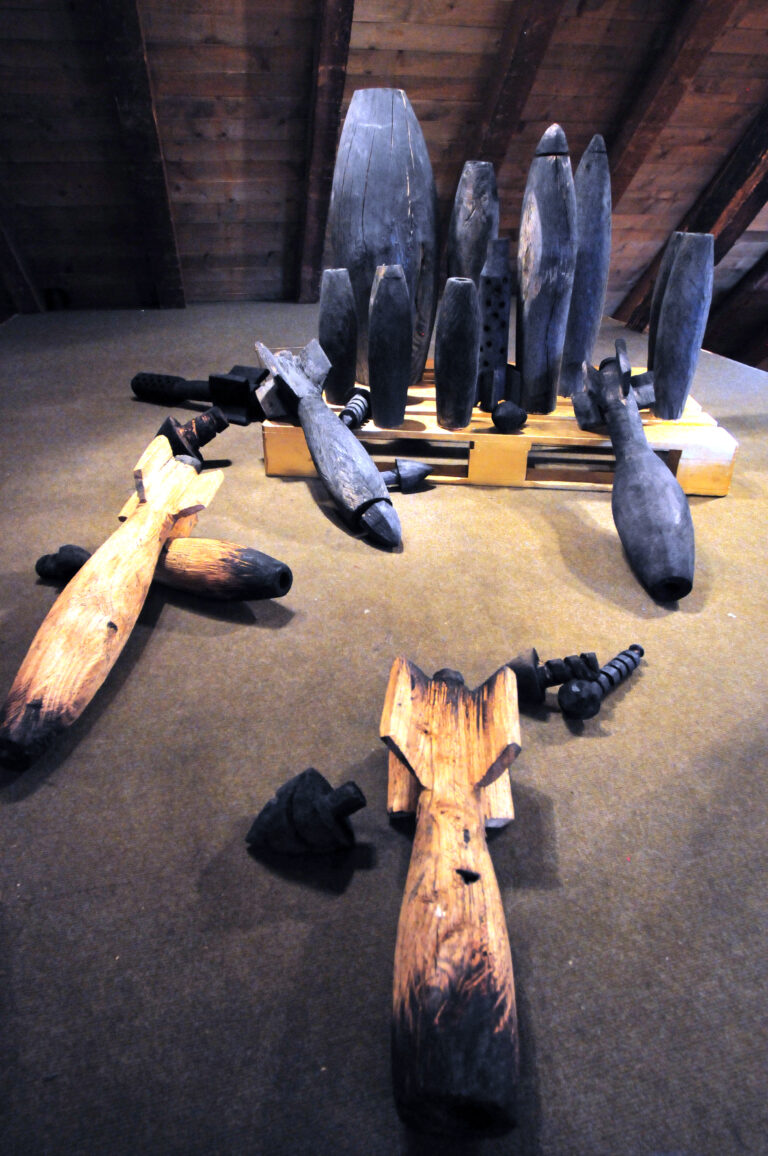 Vogelmänner recken uns schwere Schnäbel entgegen – Tiermenschen – stumme Zeugen unserer Entfremdung und zugleich in ihrer anrührenden Ausdruckskraft so nah, dass man ihre rauen Leiber berühren muss. «… Mir scheint, sie warten auf den Einbruch der erlösenden Sprache …», schreibt Martin Kolbe über die monumentale Figurengruppe der «Gerechten». Werner Neuhaus’ Skulpturen suchen in einem unaufhaltsamen Evolutionsprozess nach einer Verortung in unserer Gegenwart, wollen teilhaben an unseren Belangen: holzgesägte Bomben – irrwitziges Arsenal gegen bizarre, hochgekochte Ängste. Mit einem rustikalen Set aus Zaunpfählen und Natodraht halten wir uns die Welt vom Leib, mit Gasmasken aus Büchsen und Sacktuch erwarten wir den unausweichlichen Showdown.